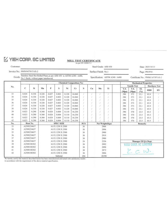 | Лист нержавеющий 1х1250х2500 Aisi 430 | 5582-75 | 08Х17 | 1 |