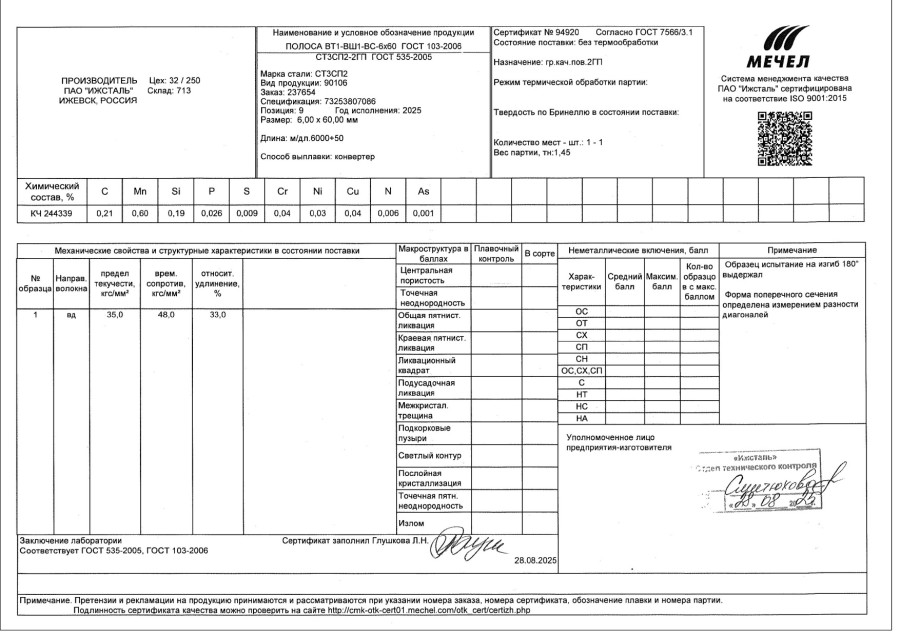 | Полоса стальная горячекатаная 60х6 | 2,83 | 103–2006 | Ст3 | — | — |